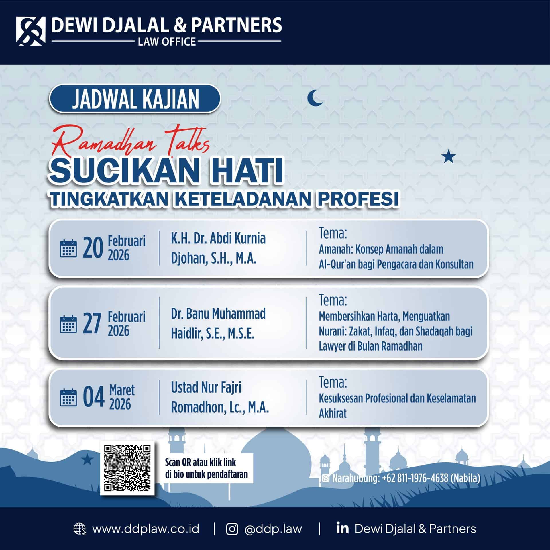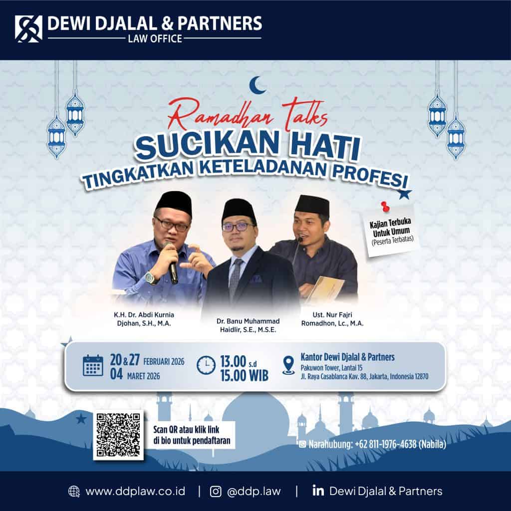 DDP menghadirkan kegiatan “Ramadhan Talks” yang akan dilaksanakan sepekan sekali selama tiga pertemuan untuk memperkaya wawasan keislaman, memperdalam makna profesi hukum, serta membangun budaya kerja yang profesional dan berkarakter di lingkungan kantor.