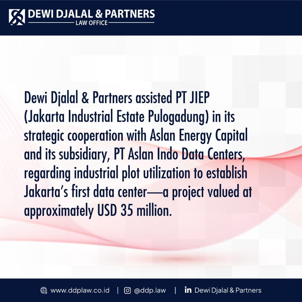 Dewi Djalal & Partners is proud to have assisted PT JIEP (Perseroda) in its strategic cooperation with Aslan Energy Capital through its subsidiary, PT Aslan Indo Data Centers, regarding industrial plot utilization to establish Jakarta’s first data center—a landmark project valued at approximately USD 36 million. This project marks a significant step forward in enhancing the region’s digital ecosystem and meeting the growing demand for high-tier data infrastructure.