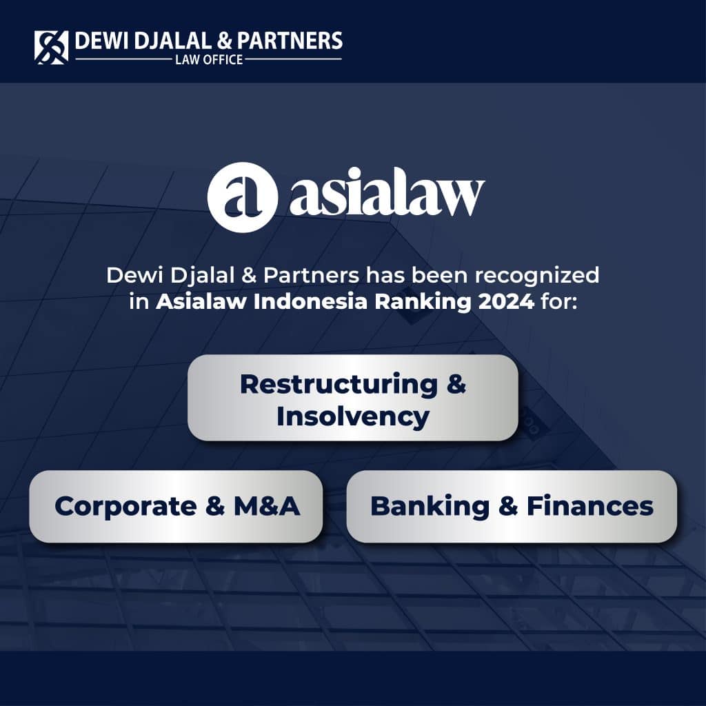 Dewi Djalal & Partners is honored and filled with gratitude to be recognized in Asialaw Indonesia Ranking 2024 for practice areas: Restructuring & Insolvency Corporate and M&A Banking & Finances We could not have turned these challenges into blessings without the satisfaction and loyalty of our clients.   We truly appreciate the trust you’ve placed